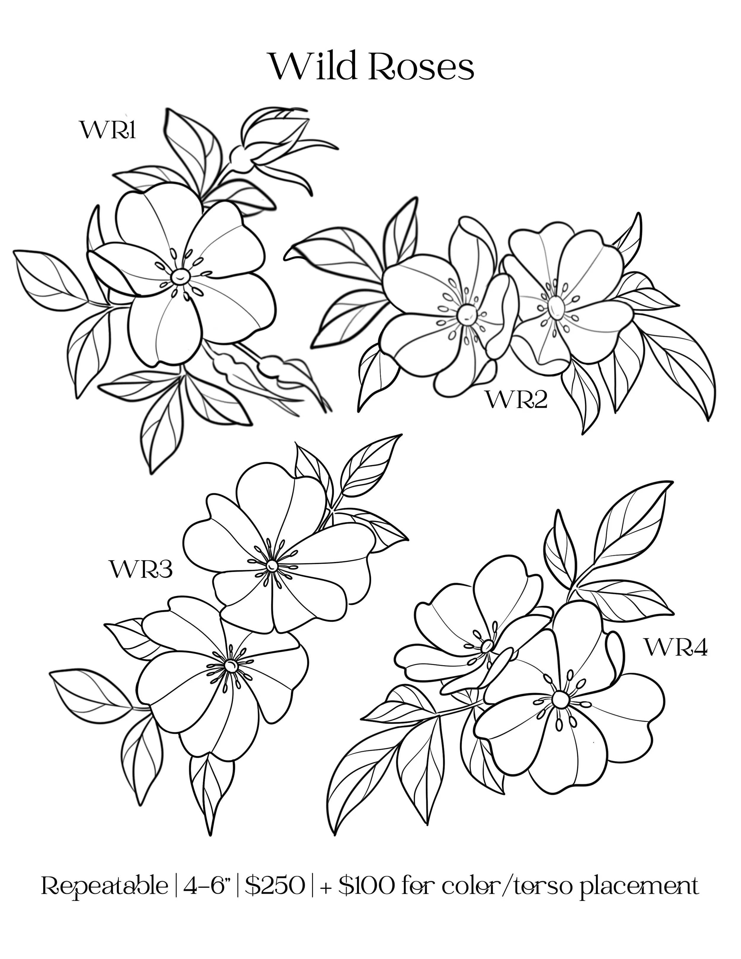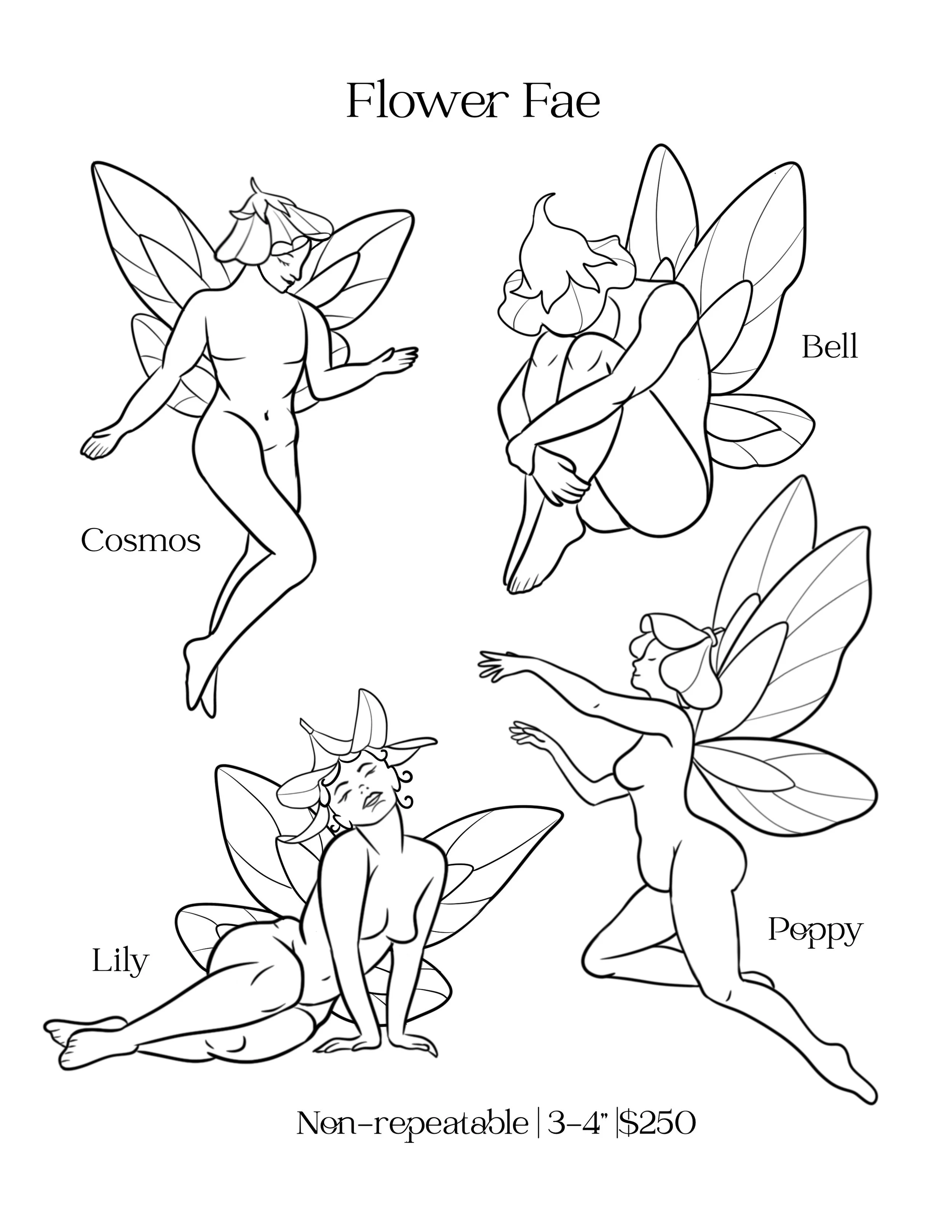All of these designs are available to be tattooed by Michelle Pomerantz. “Flash” designs are repeatable by nature, and most are available in both black in grey or color.